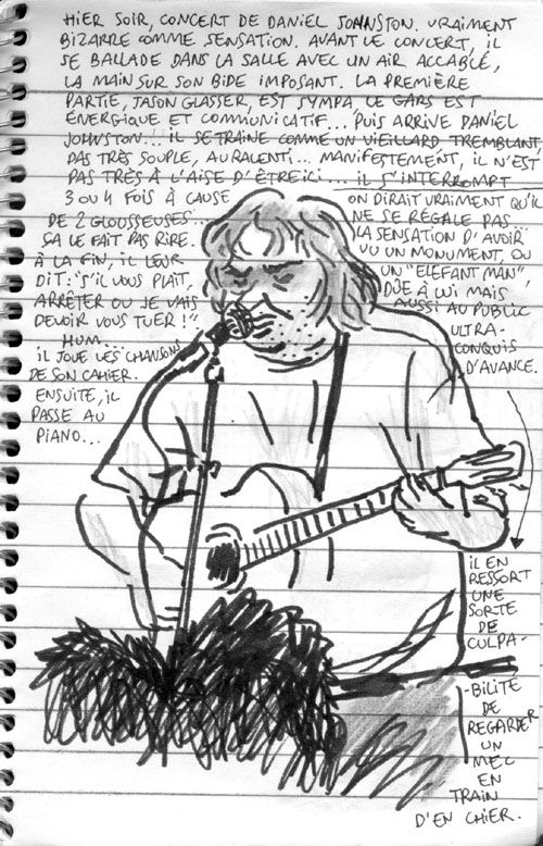 De 1981 à aujoud’hui, des premières cassettes distribuées de la main à la main à une distribution internationale, de la lo-fi pure à des oeuvres plus produites, Daniel Johnston n’a pas changé sa ligne de conduite : émotion brute et naïve, énergie juvénile, refrains accrocheurs, mélodies instinctives. Sa musique est devenu son journal intime. Il narre toujours ses amours pour Laurie, fanées avant même d’éclore, rend hommage à ses héros, Captain America, King Kong, les Beatles… Son chant qui déraille parfois et sa fantaisie enfantine et poétique rendent ses prestations scéniques émouvantes et uniques.